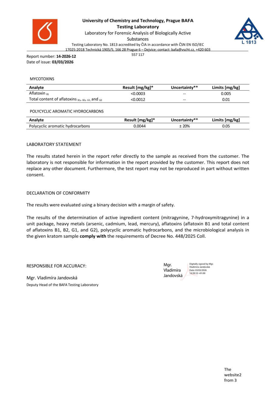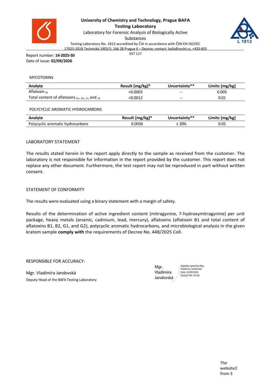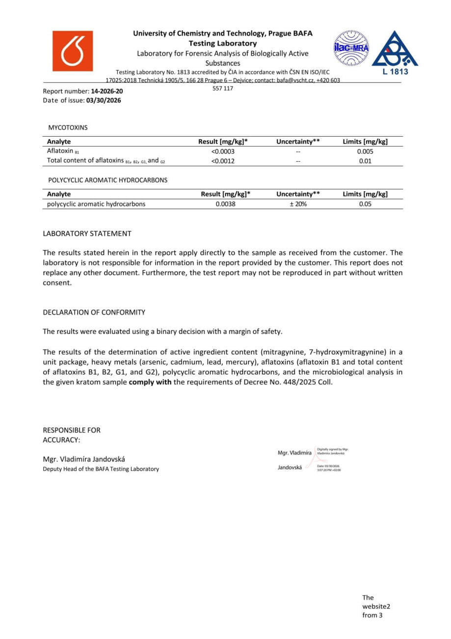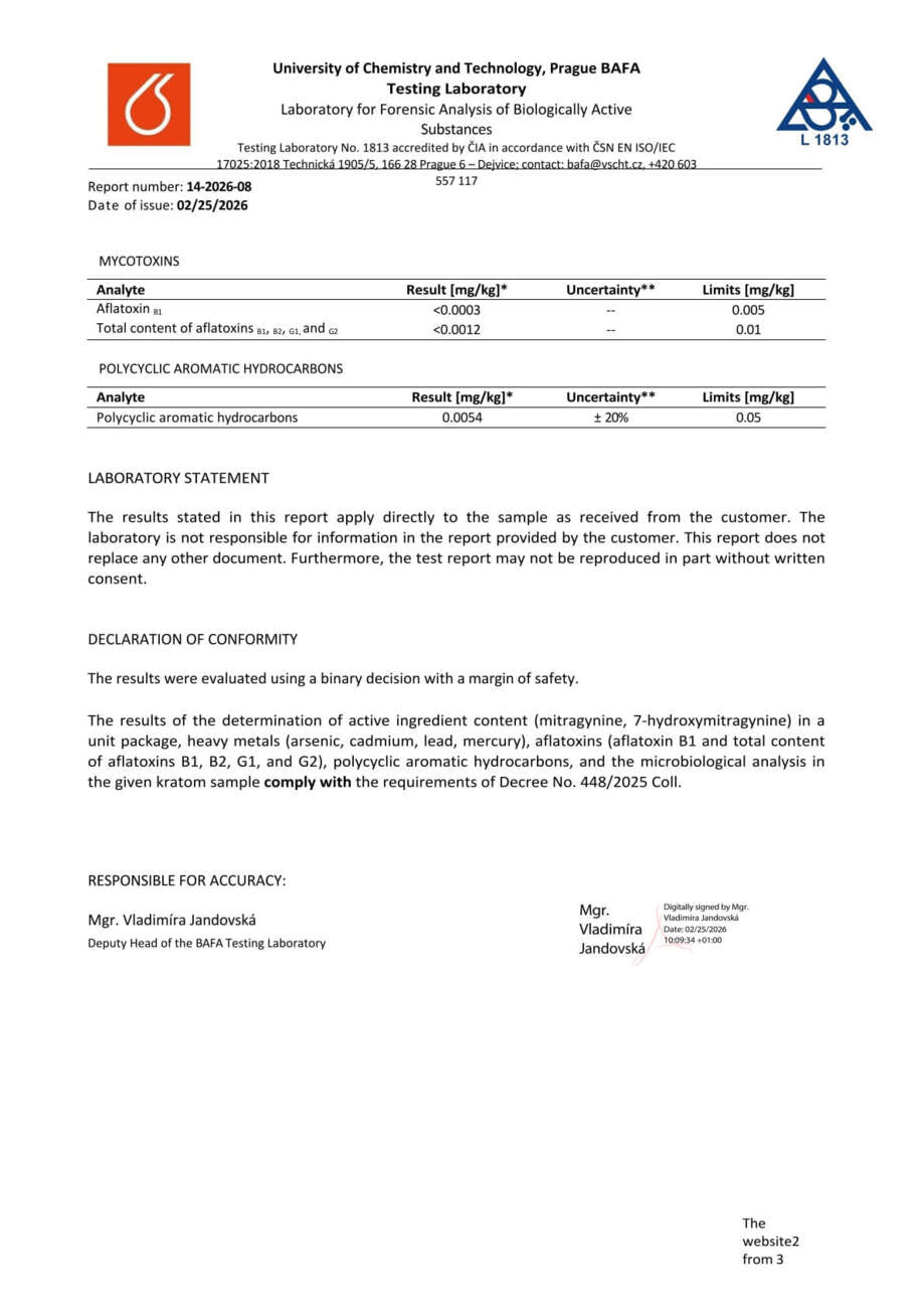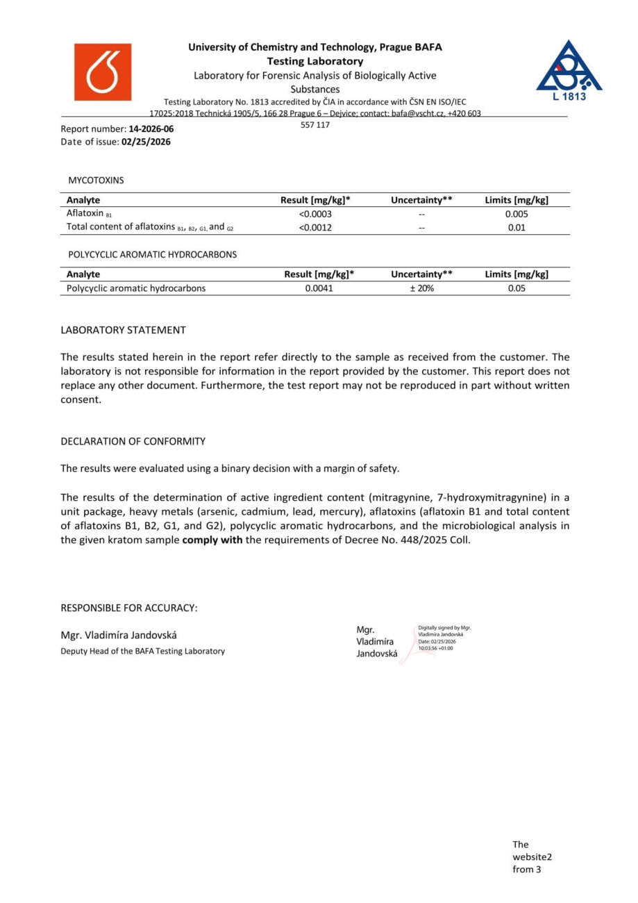 Con nosotros, tiene la seguridad de que está comprando kratom de alta calidad. Cada lote se somete a rigurosas pruebas en la Universidad de Química y Tecnología de Praga, donde se verifica el porcentaje exacto de alcaloides, la presencia de mohos vivos y no vivos, y el contenido de metales pesados. Gracias a ello, se garantiza la pureza, la seguridad y una calidad constante en cada envase.