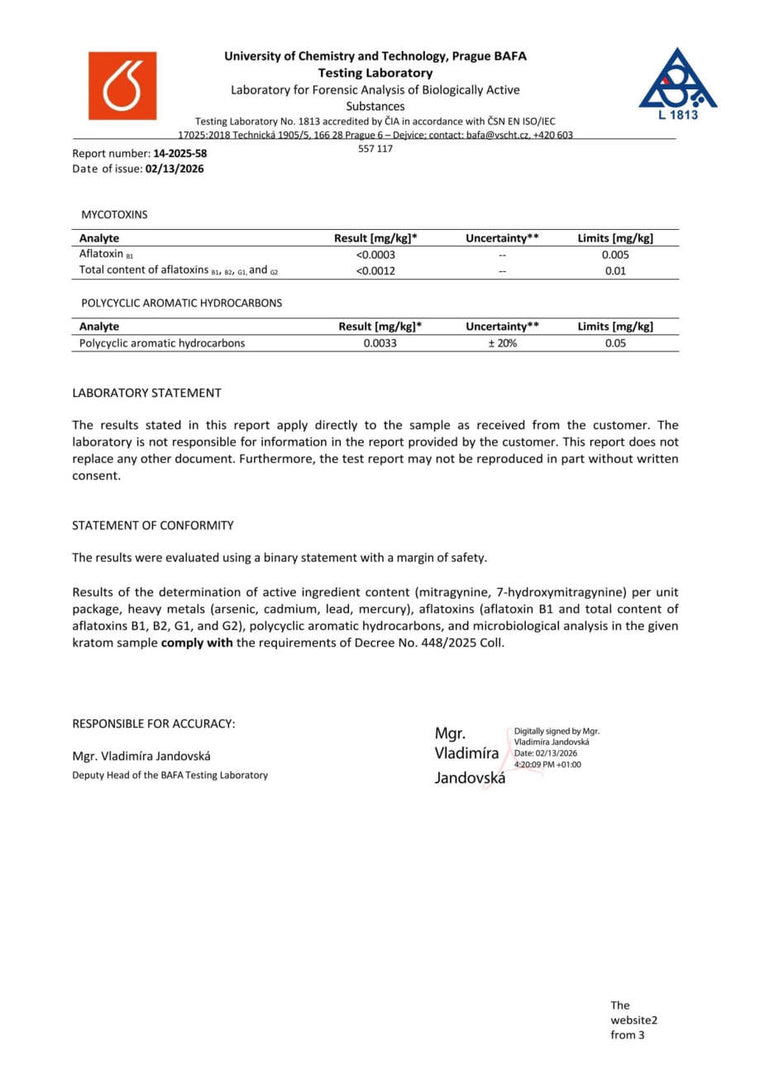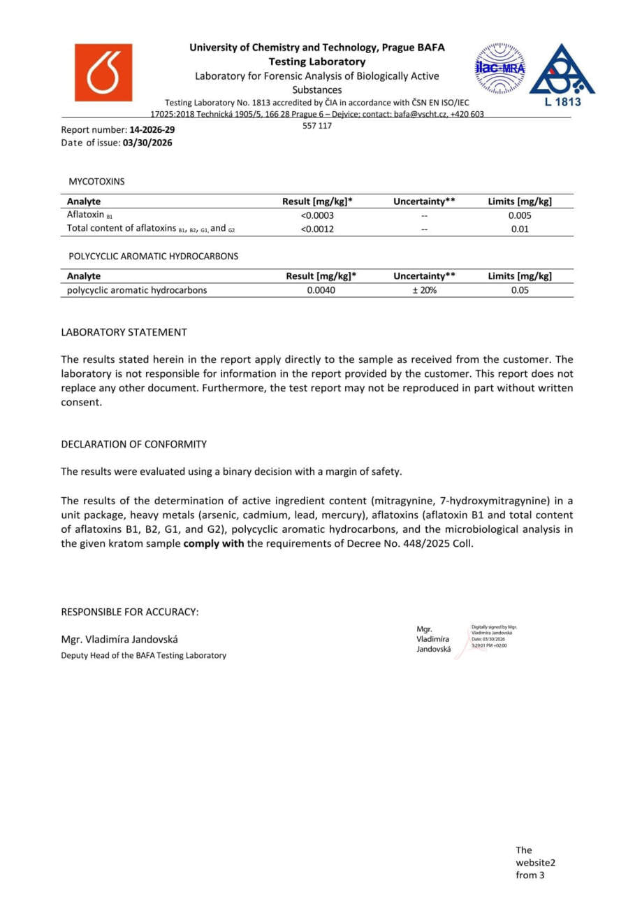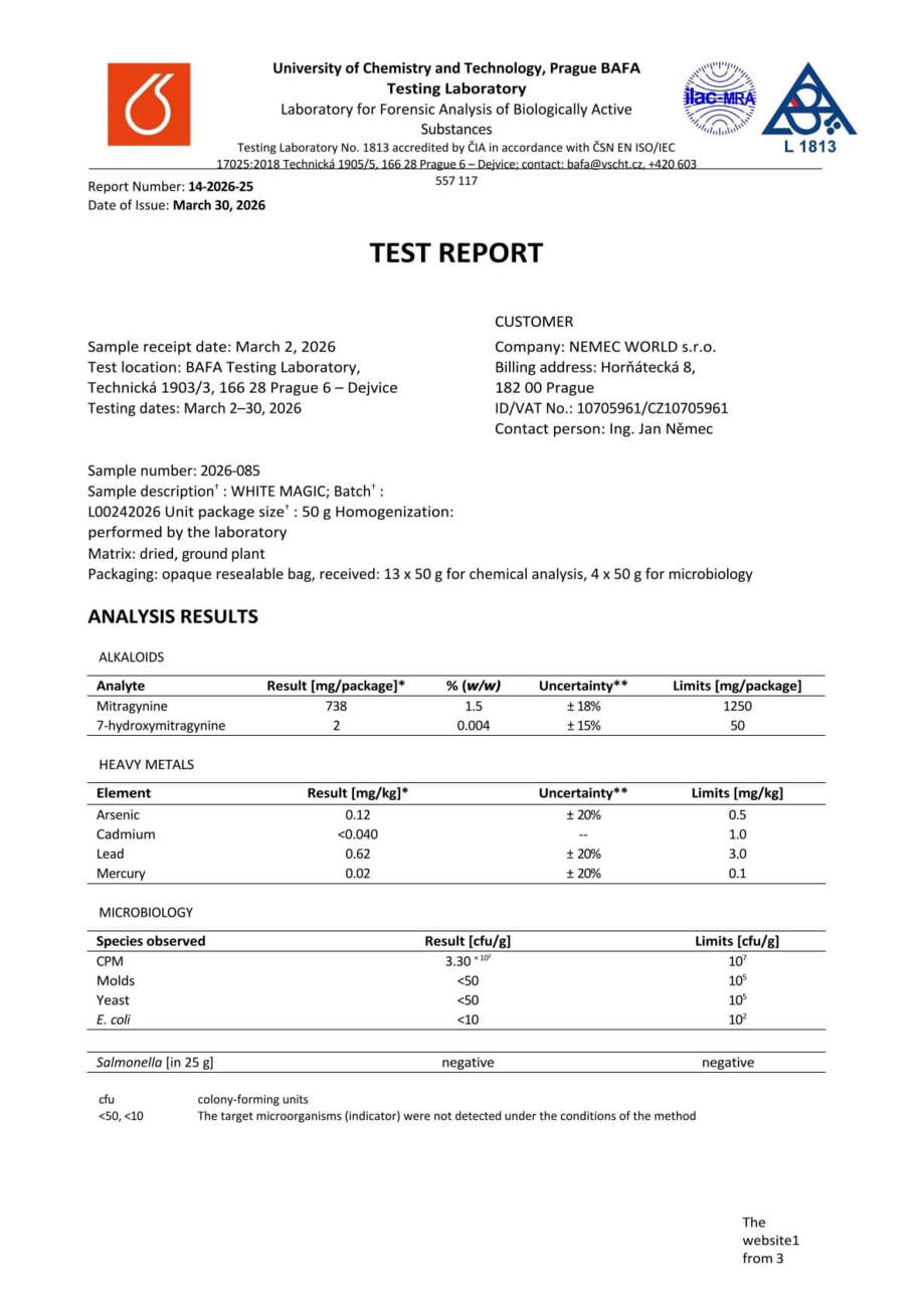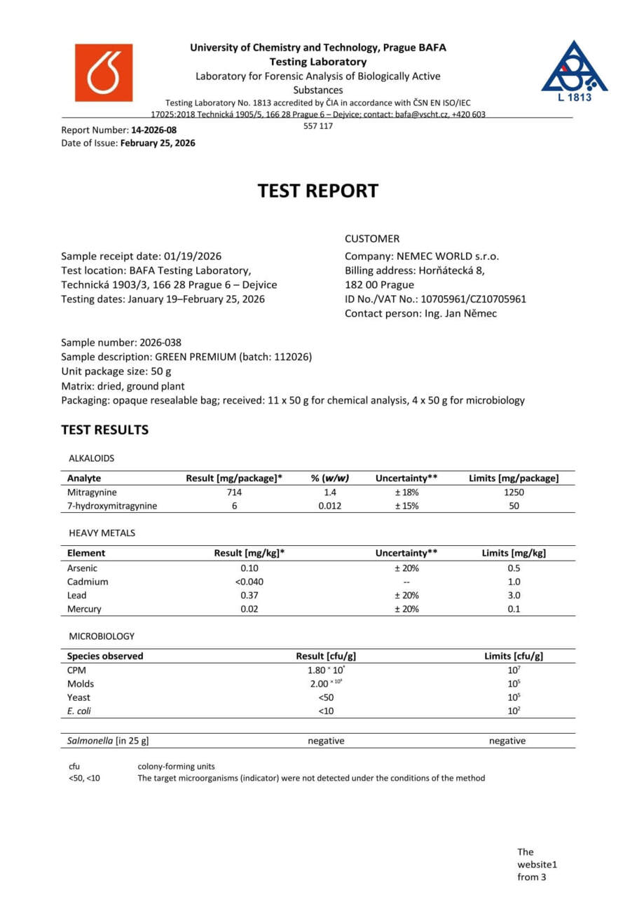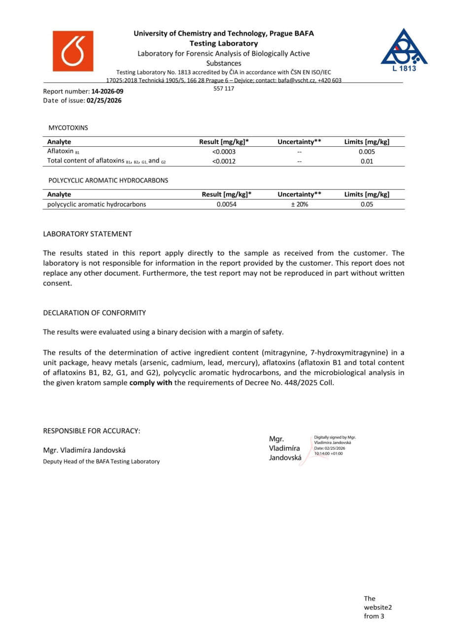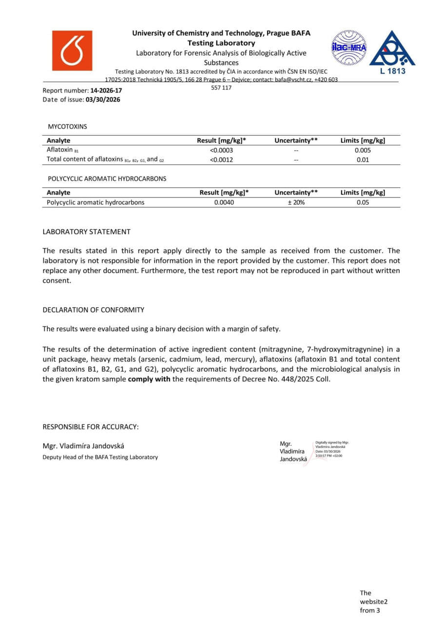 Con nosotros, tiene la seguridad de que está comprando kratom de alta calidad. Cada lote se somete a rigurosas pruebas en la Universidad de Química y Tecnología de Praga, donde se verifica el porcentaje exacto de alcaloides, la presencia de mohos vivos y no vivos, y el contenido de metales pesados. Gracias a ello, se garantiza la pureza, la seguridad y una calidad constante en cada envase.