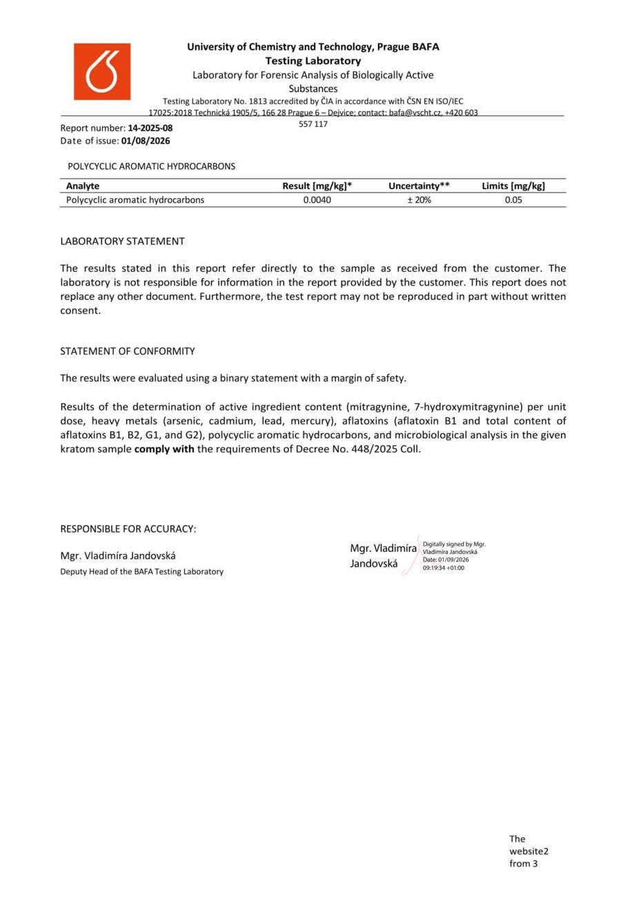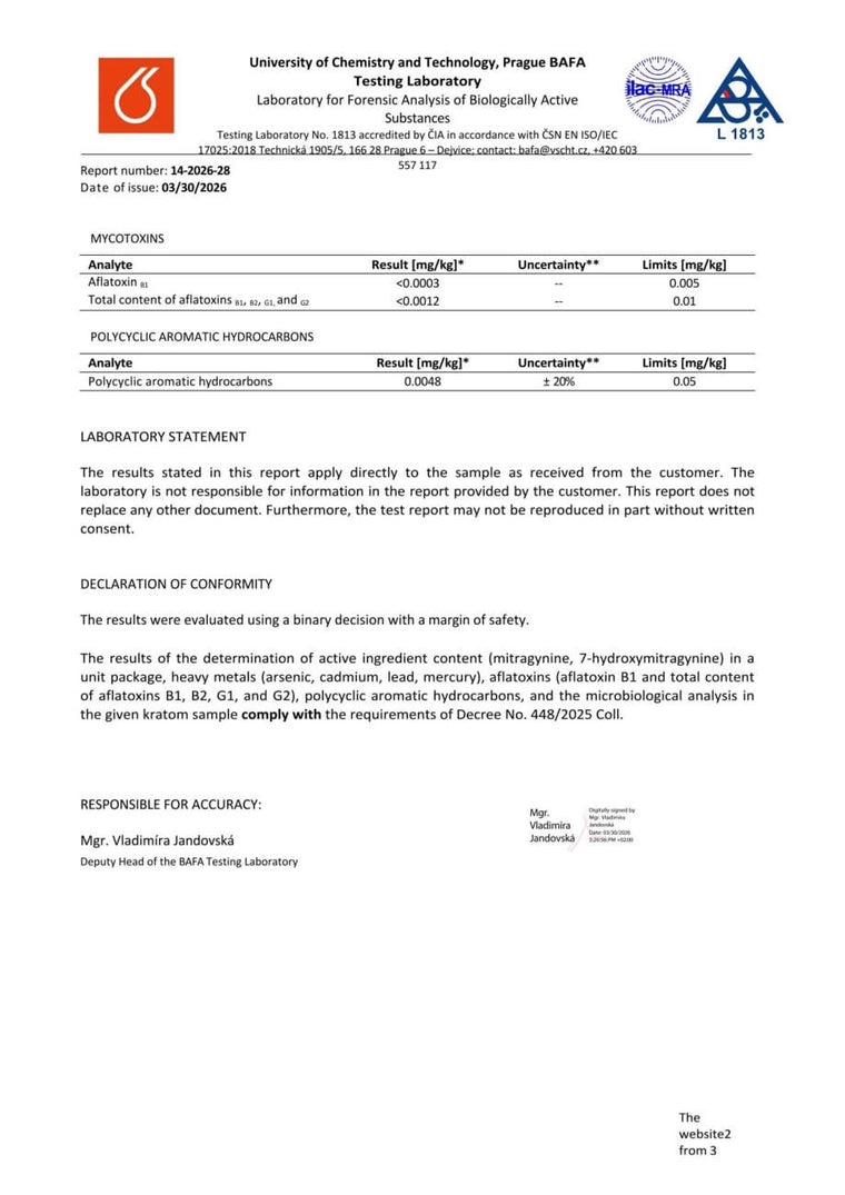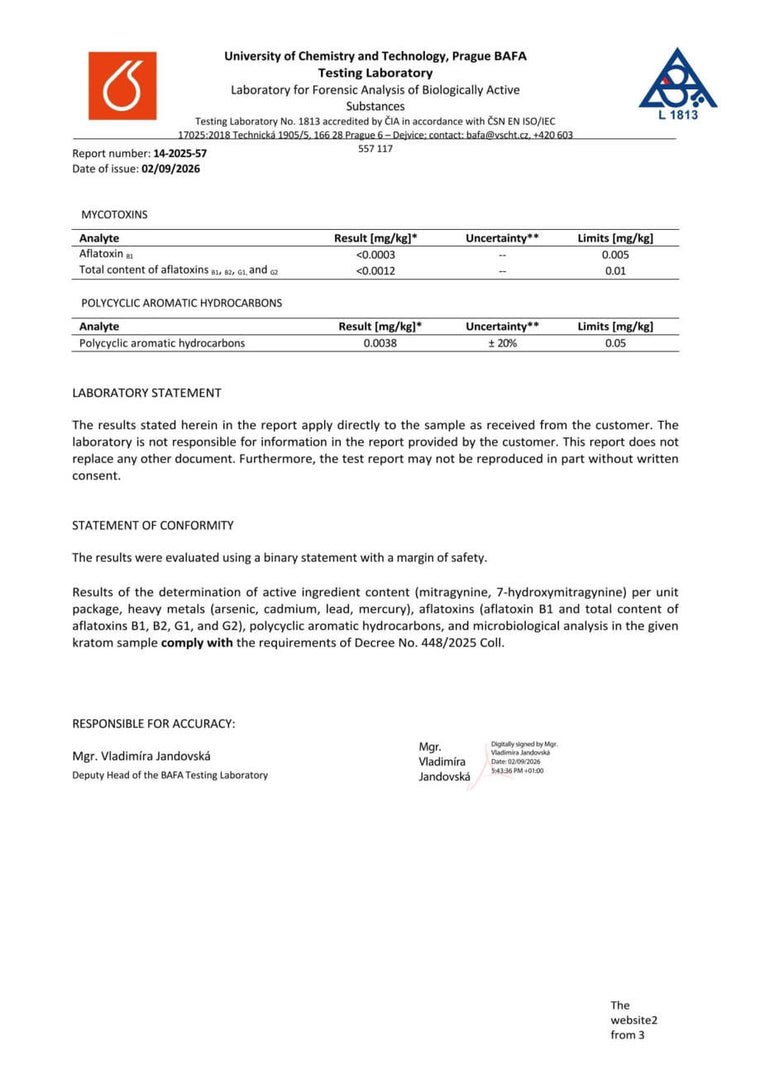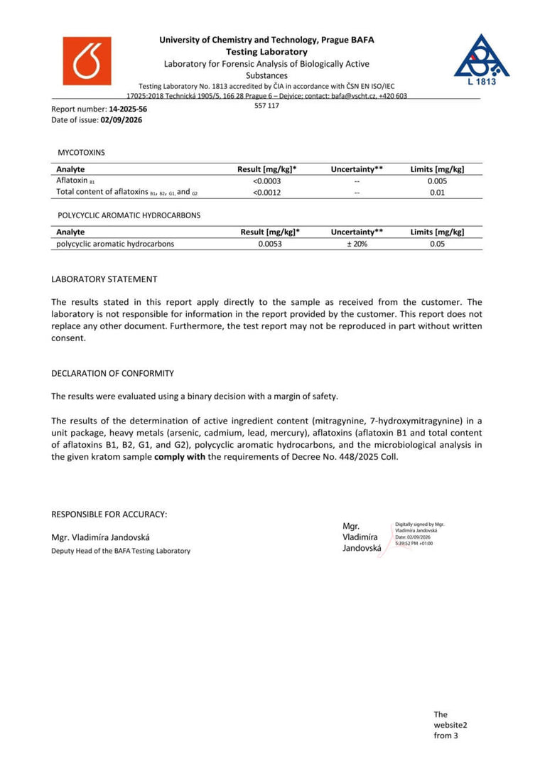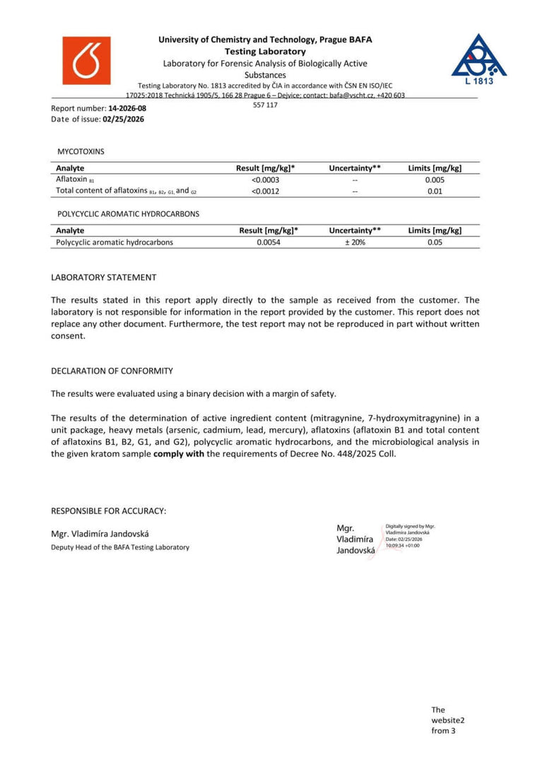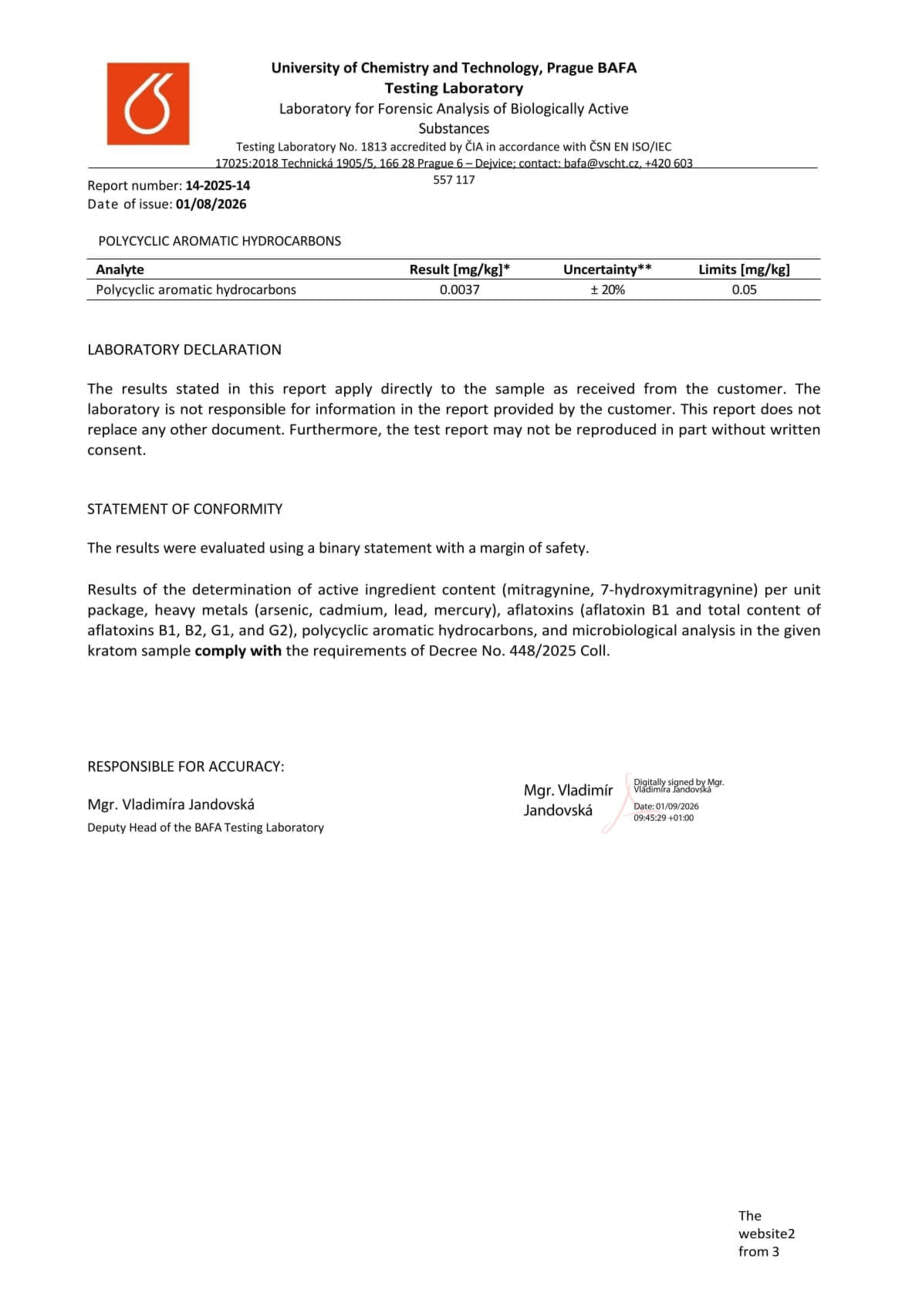 Con nosotros, tiene la seguridad de que está comprando kratom de alta calidad. Cada lote se somete a rigurosas pruebas en la Universidad de Química y Tecnología de Praga, donde se verifica el porcentaje exacto de alcaloides, la presencia de mohos vivos y no vivos, y el contenido de metales pesados. Gracias a ello, se garantiza la pureza, la seguridad y una calidad constante en cada envase.