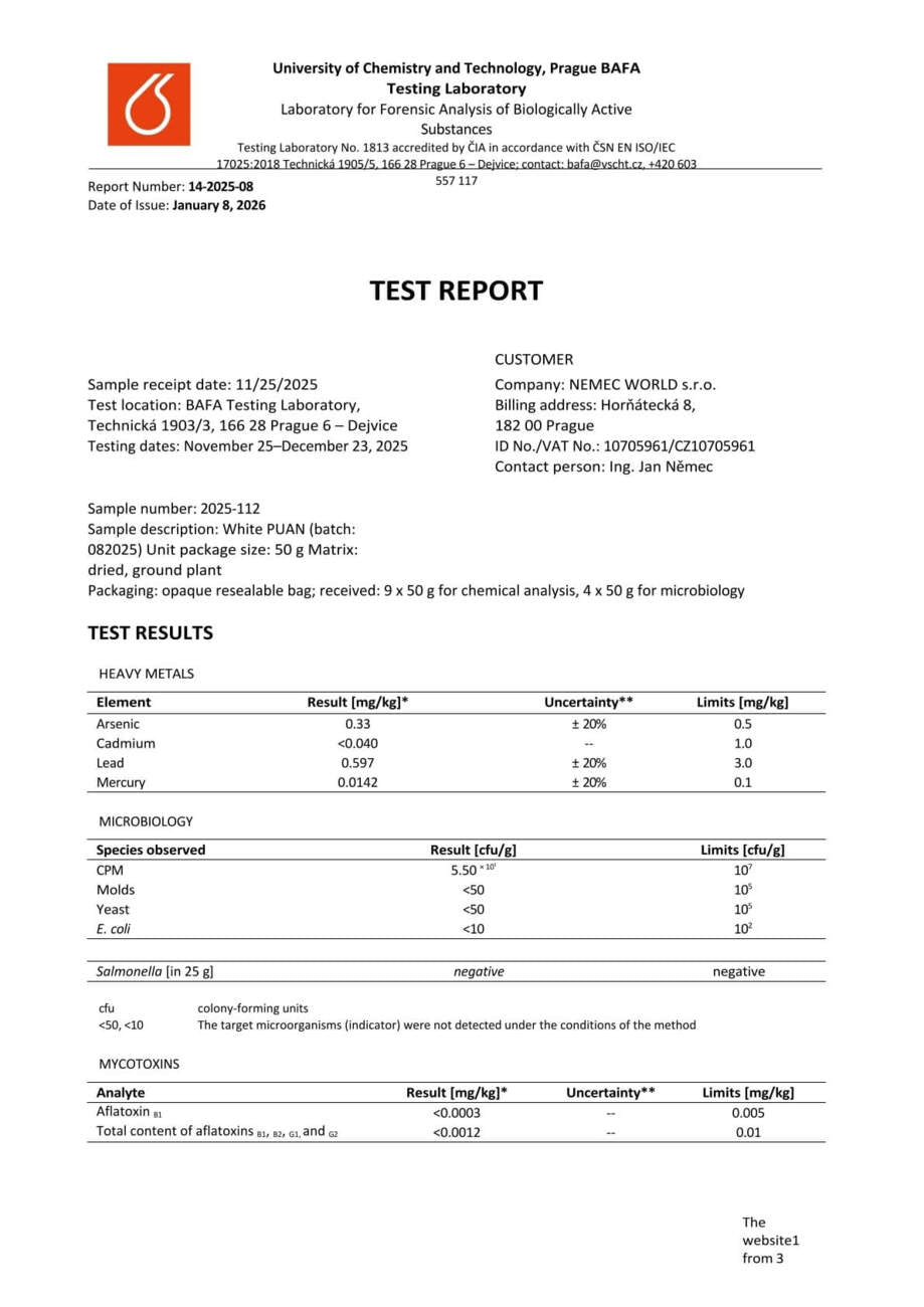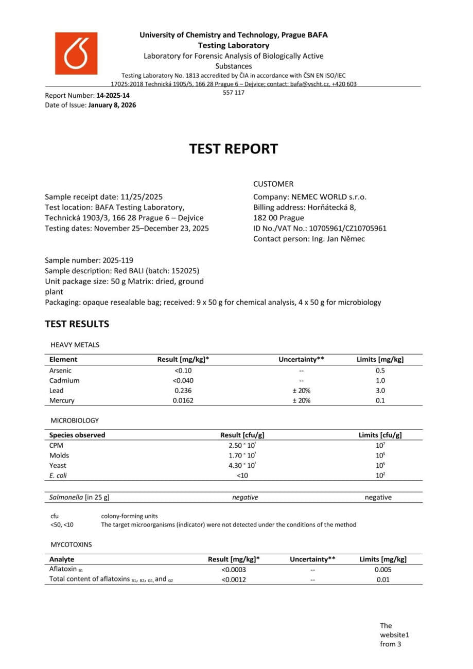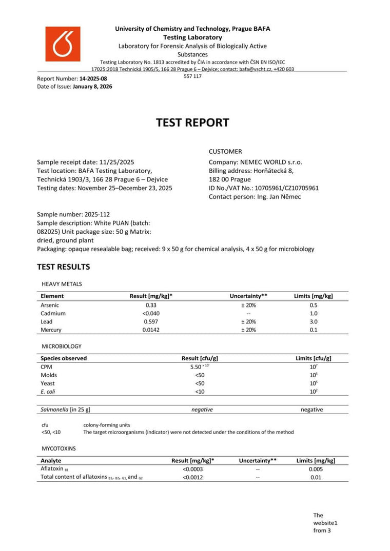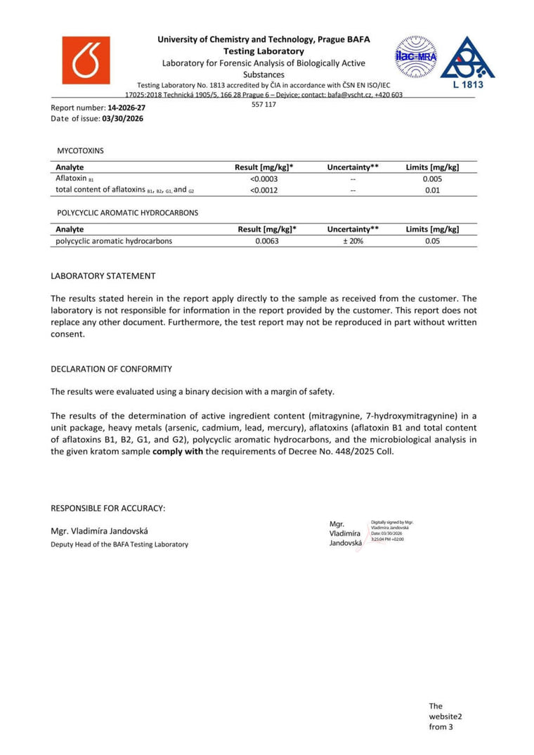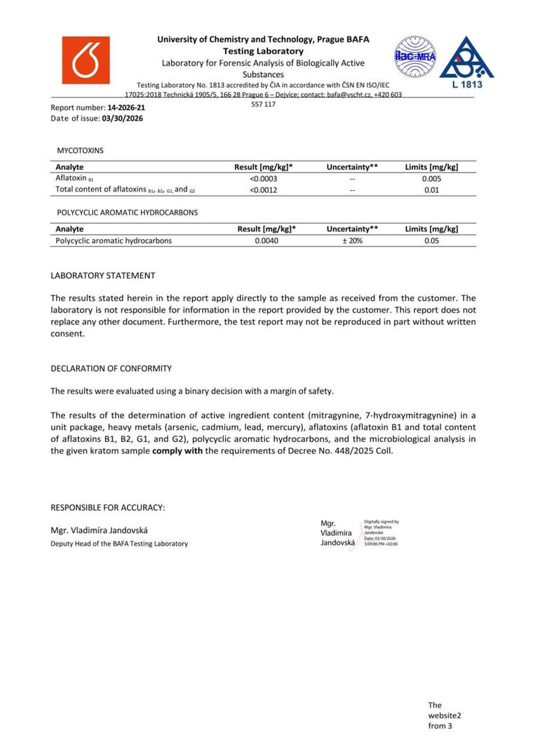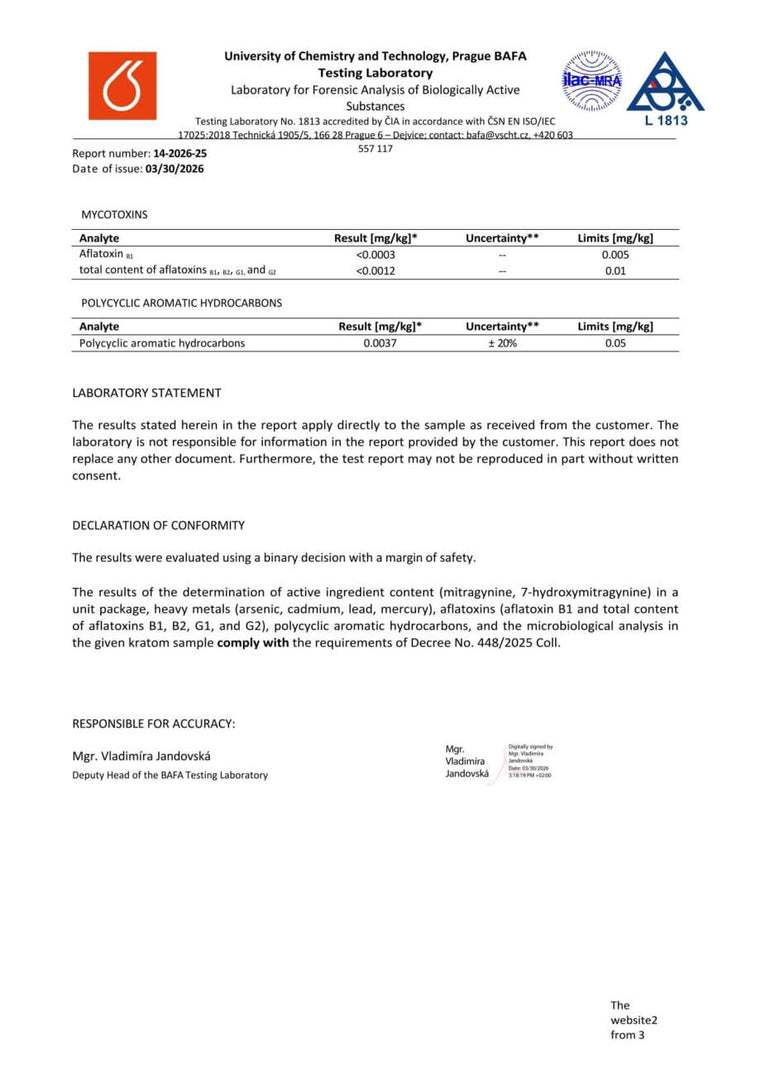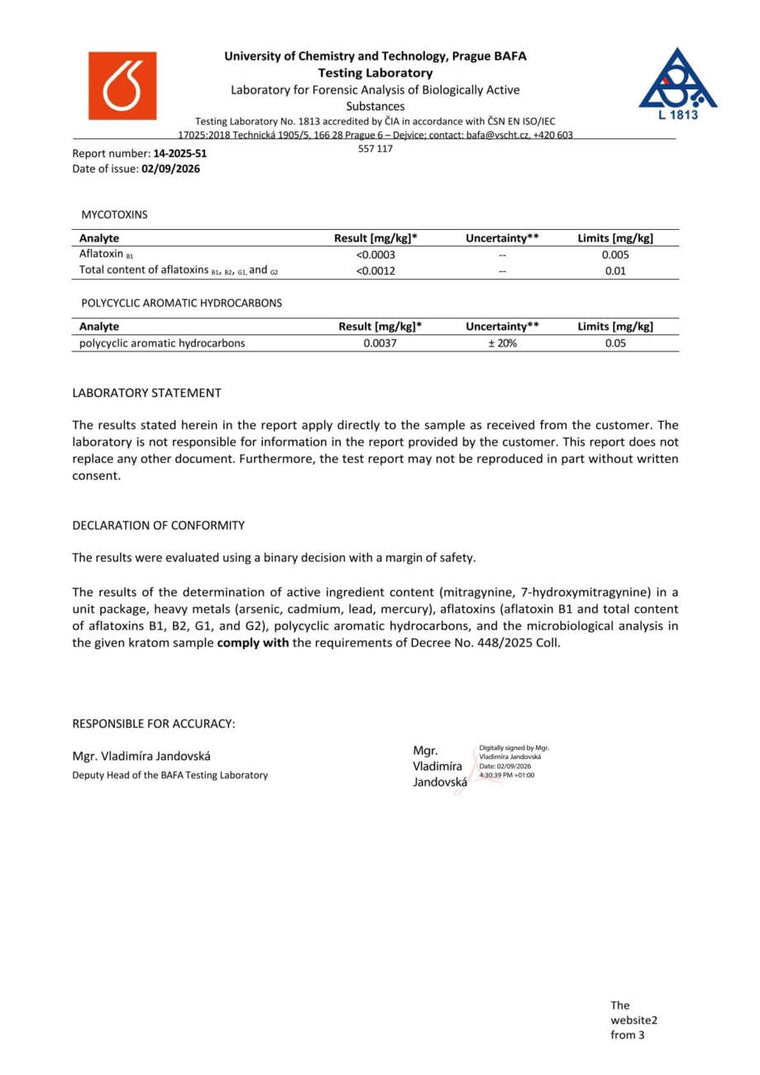 Con nosotros, tiene la seguridad de que está comprando kratom de alta calidad. Cada lote se somete a rigurosas pruebas en la Universidad de Química y Tecnología de Praga, donde se verifica el porcentaje exacto de alcaloides, la presencia de mohos vivos y no vivos, y el contenido de metales pesados. Gracias a ello, se garantiza la pureza, la seguridad y una calidad constante en cada envase.