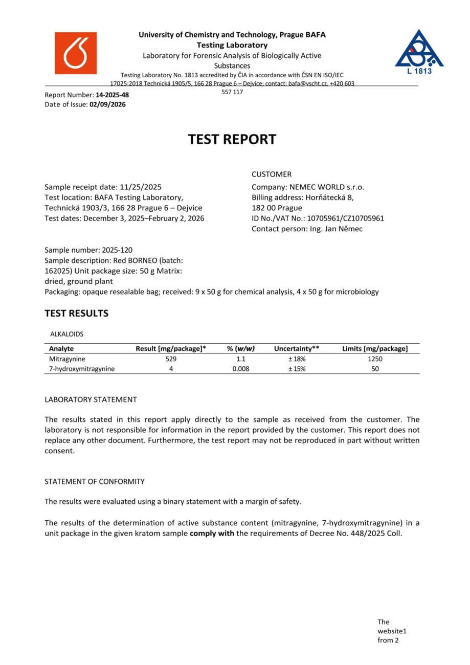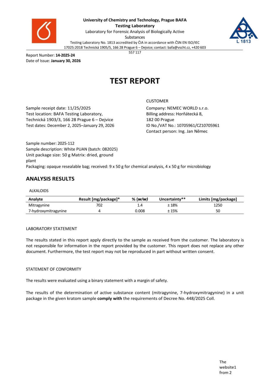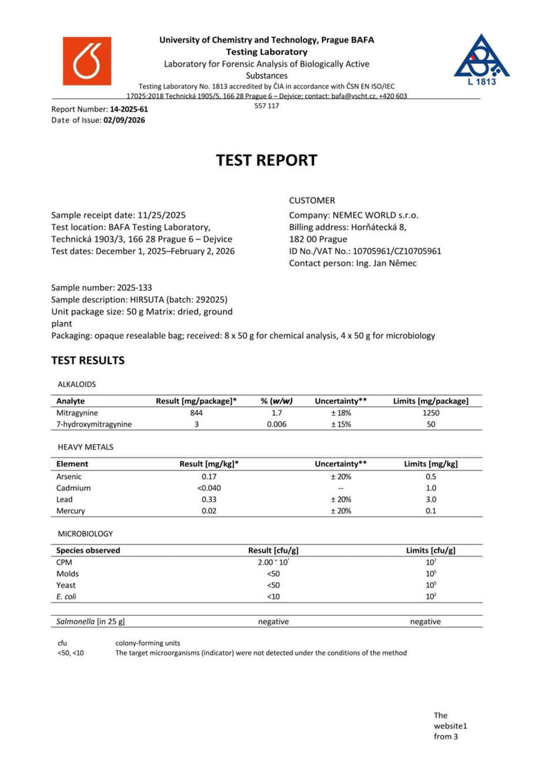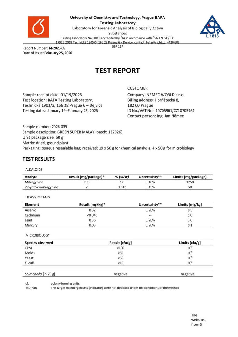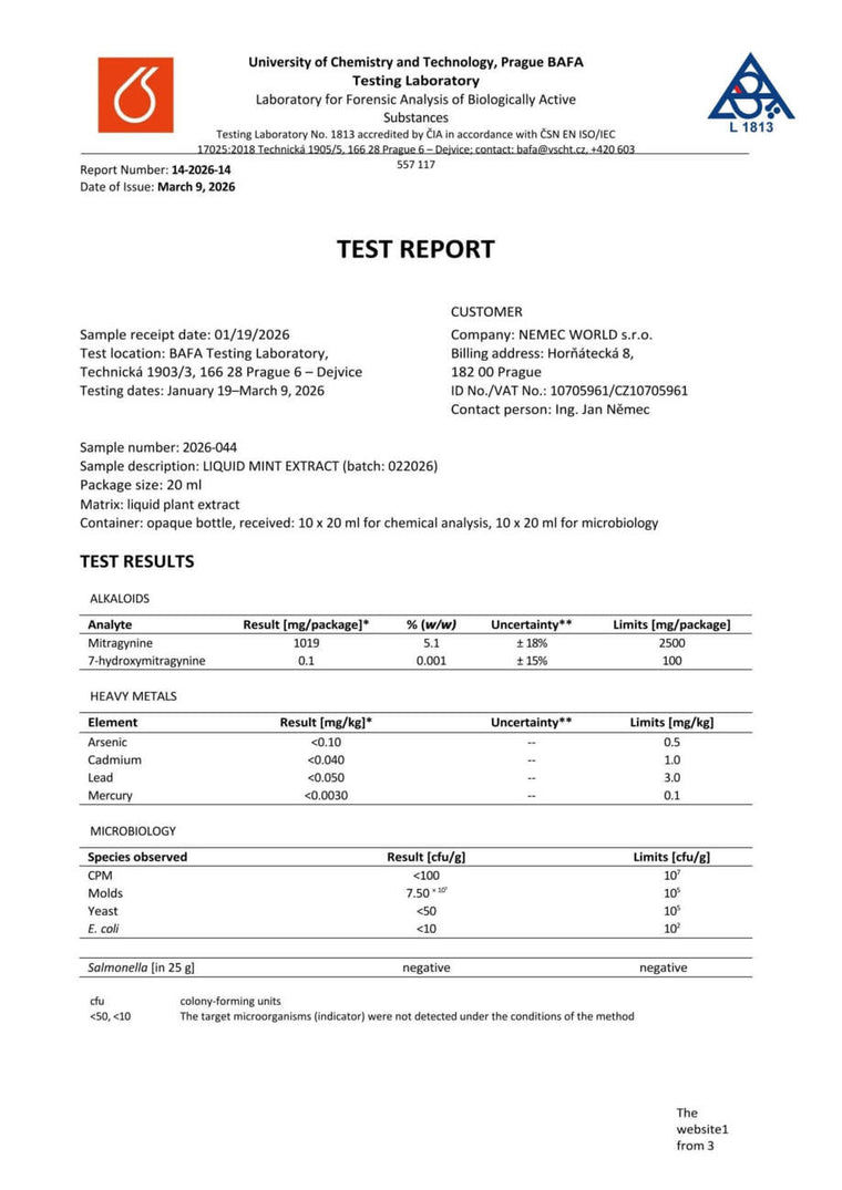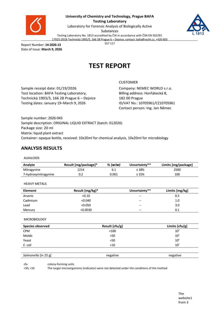 Bei uns können Sie sicher sein, dass Sie Kratom von höchster Qualität kaufen. Als einziges Unternehmen auf dem europäischen Markt testen wir jede Charge sorgfältig bei VŠCHT in Prag, wo wir den genauen Prozentsatz an Alkaloiden und das Vorhandensein von lebenden oder nicht lebenden Pilzen bestimmen.